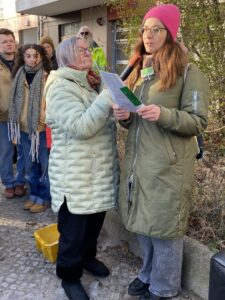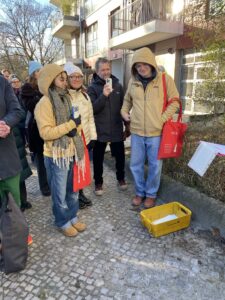 Am Sonntag, 15.2.2025 wurden in Lichtenberg am Stadtpark 12 fünf Stolpersteine verlegt: Für Erna Segal, geb. Klahr, Aron Segal, Hugo Segal, Gerda Segal, verh. Weiss und Manfred Segal. Es war eine sehr bewegende Veranstaltung, da Michelle Segal, Manfred Segals Tochter, mit ihrem Mann und ihren beiden Kindern aus den USA angereist war, um bei der Stolpersteinverlegung zugegen zu sein. Mehr als 60 Personen haben die Veranstaltung besucht, bei der es mehrere Redebeiträge gab, u.a. von Michelle Segal. Im Anschluss an die Stolpersteinverlegung ergaben sich zahlreiche interessante Gespräche zwischen den Angehörigen, Anwohnenden und Kundgebungsteilnehmenden. Familie Segal wurden die vom AK Stolperstein zusammengetragenen Recherchen über ihre Familienmitglieder auf Englisch übergeben, ein Original eines Passierscheins von Michelles Vater Manfred Segal, der vom AK Stolpersteine bei den Recherchen in einem Archiv gefunden wurde und auch die Postkarten und Bildungsmaterialien zu widerständigen Frauen gegen den Nationalsozialismus in Lichtenberg, in denen auch Erna und Gerda Segal und ihr Überleben im Untergrund in Lichtenberg porträtiert werden.